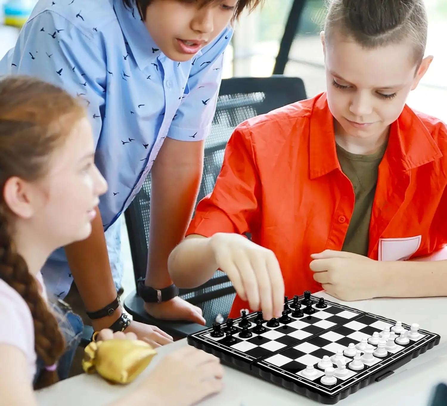 > Compact Convenience - portable chess set measuring just and folding to almost the size of a phone , our mini chess board is the perfect travel companion. Easy to pack, effortless to play.
