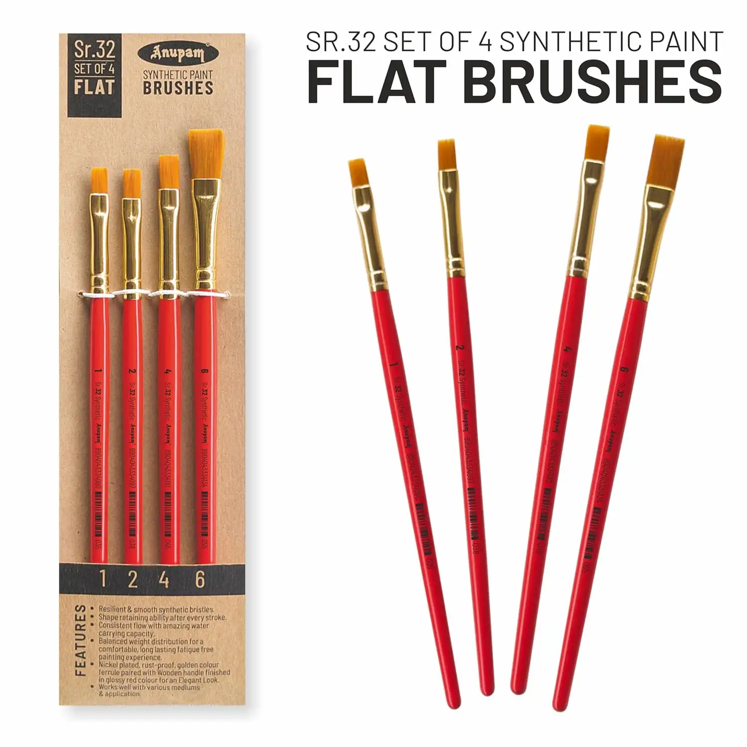 > Elegant and Durable Construction : These brushes are designed to last, featuring rust-proof nickel-plated golden ferrules and glossy red-finished wooden handles for a sleek, sophisticated look. The ferrules are double-crimped to securely hold the bristles, ensuring they don’t loosen or shed over time. Each brush is carefully inspected and packed to guarantee a high-quality, contaminant-free product. The durable materials and elegant construction make the Anupam Sr. 32 brush set a professional-grade tool that adds both functionality and style to your painting kit.