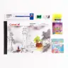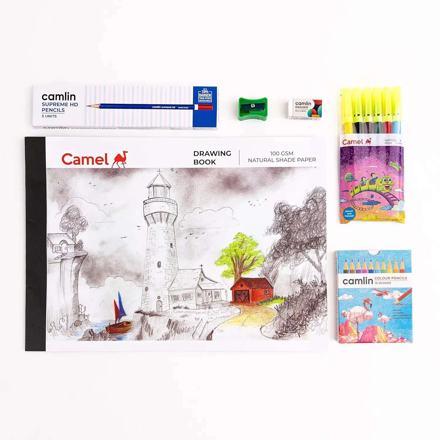 > 1 Drawing book, 1 Sketch pens 6 shades, 1 Colour pencils 10 shades, Supreme HD pencil pack of 5, 1 Eraser, 1 Sharpener