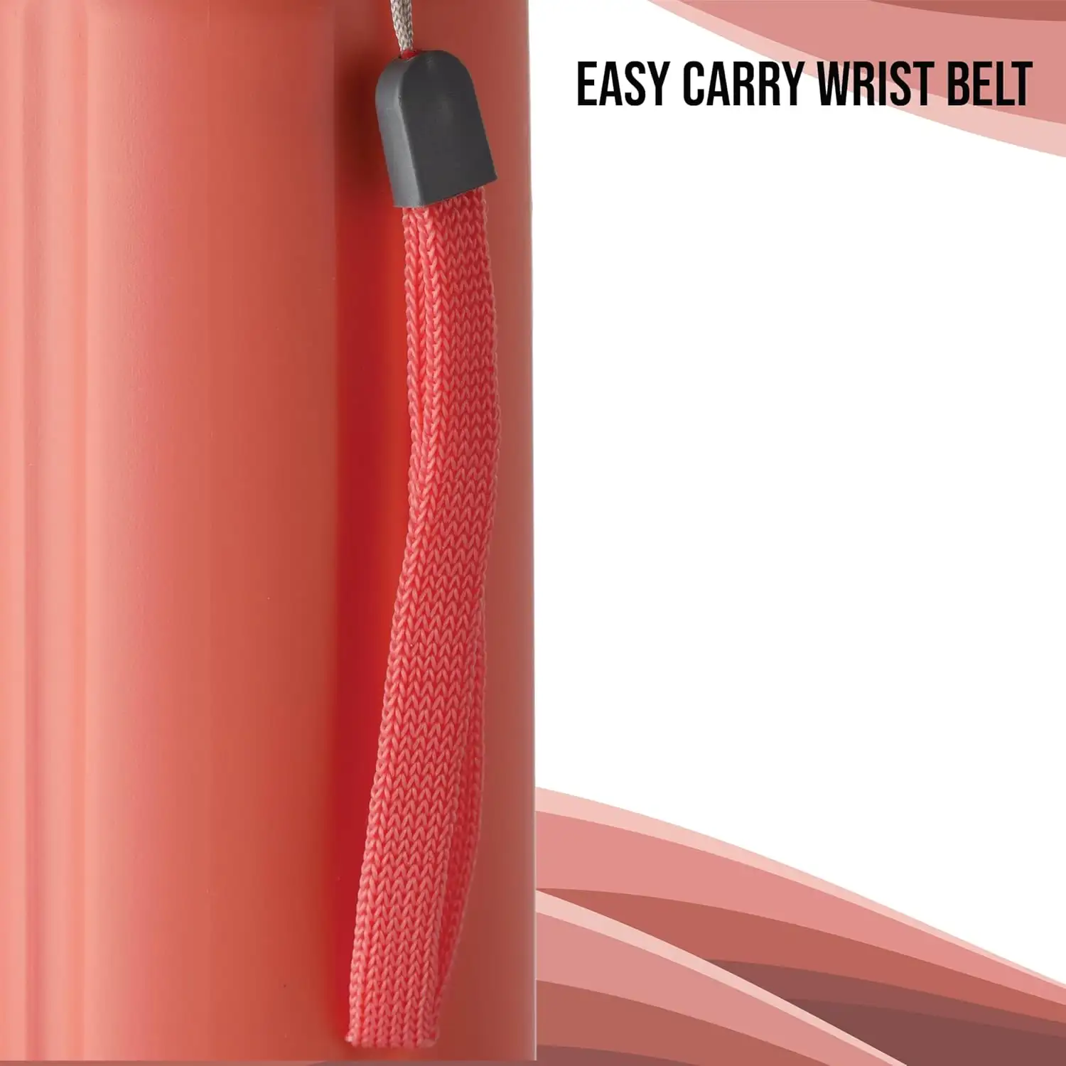 > Handy and Durable : Made of food grade 18/8 stainless steel and 100% BPA free food safe plastic this water bottle is built to last, resistant to oxidation and rust it does not leave a metal taste in your beverage, sleek shape also ensures a better grip and a handy wrist strap helps carry it with ease and also hang if necessary