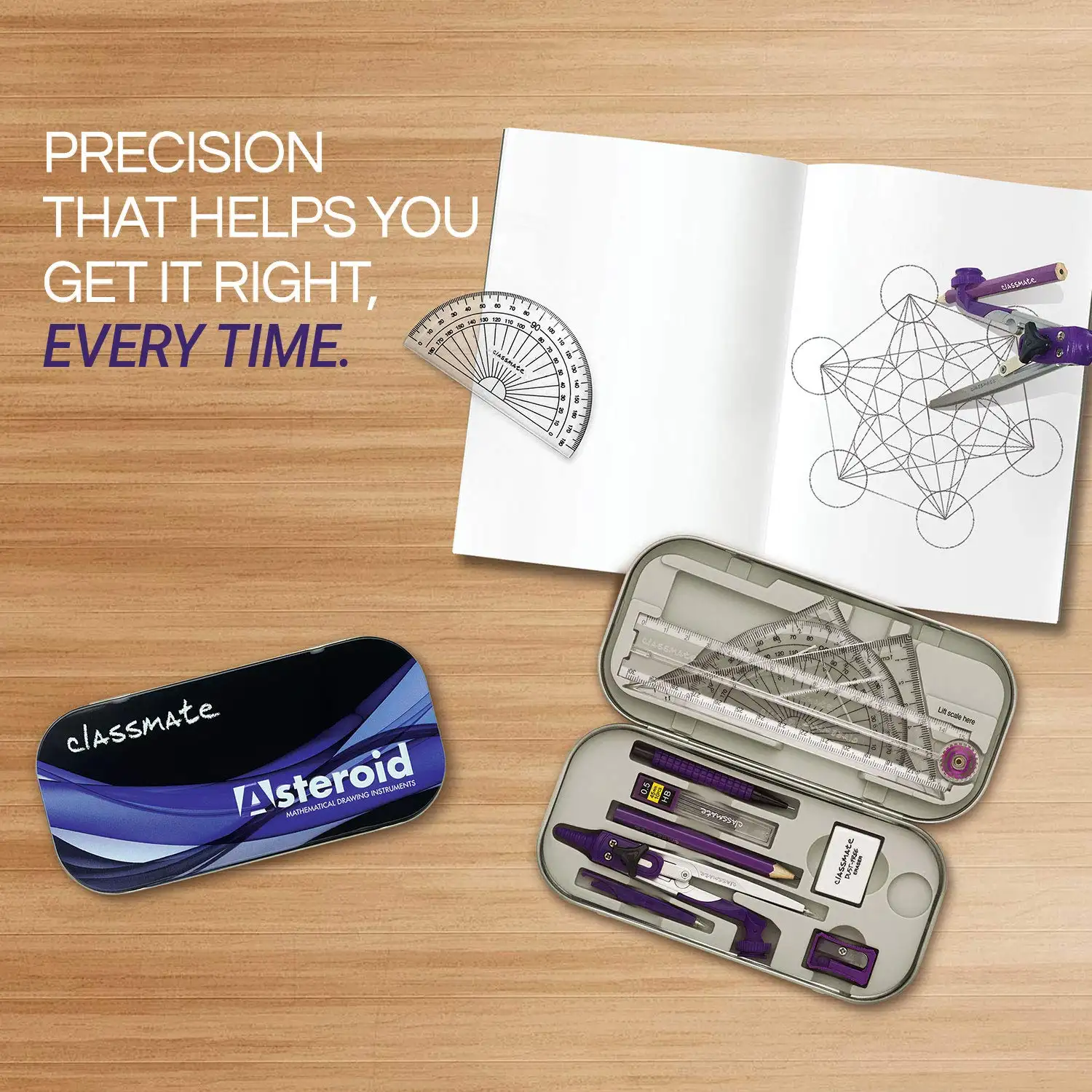 Classmate Asteroid Geometry Box | Compass-cum-Divider with arm locking mechanism | 30 cm Foldable Scale| Mechanical Pencil | Double sided tray | Pack Of 1