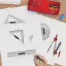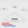 > Protractor and set-square with beveled edges ensure precise measurements.