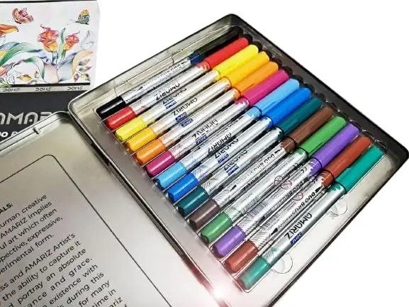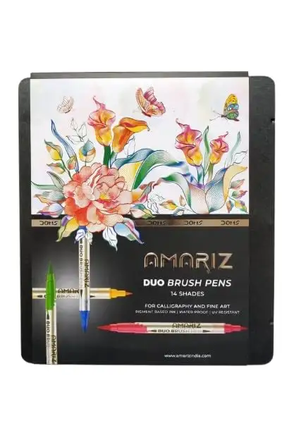 Doms Amariz Duo Brush Pens 14 Shades| Nylon Brush Tip & Fine Tip in 1 Brush Pen| For Calligraphy & Fine Art| Pigment Based Ink, Water Proof| Premium Metal Box Packing | Pack of 1