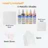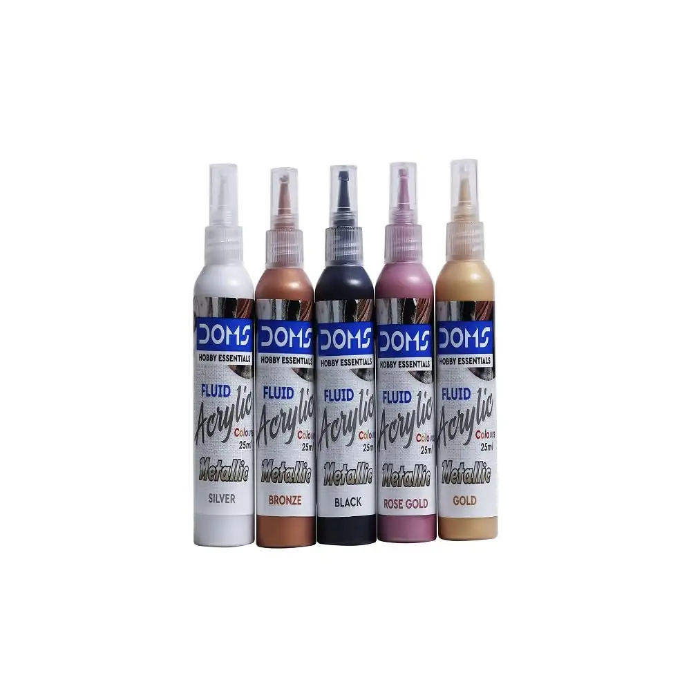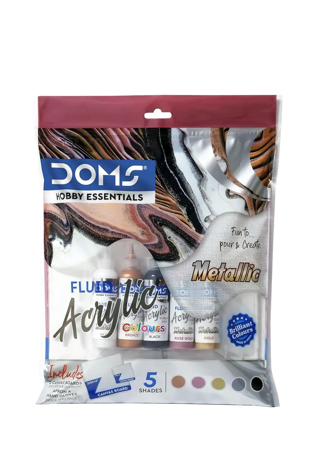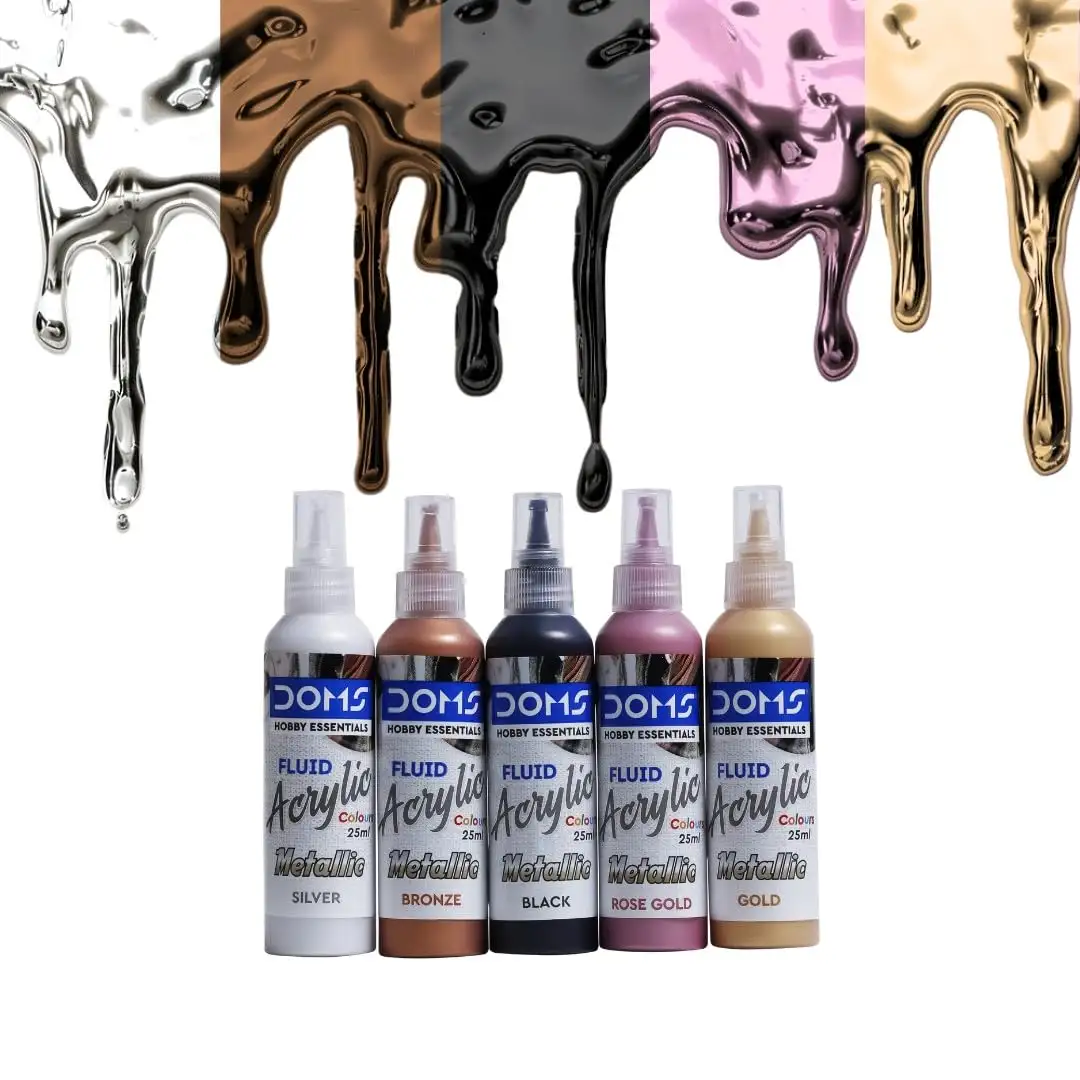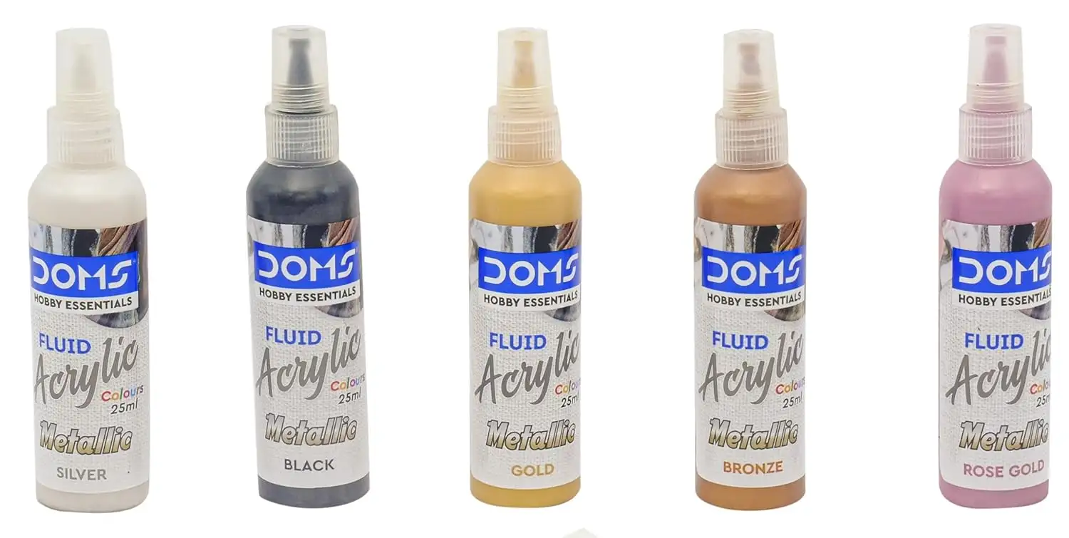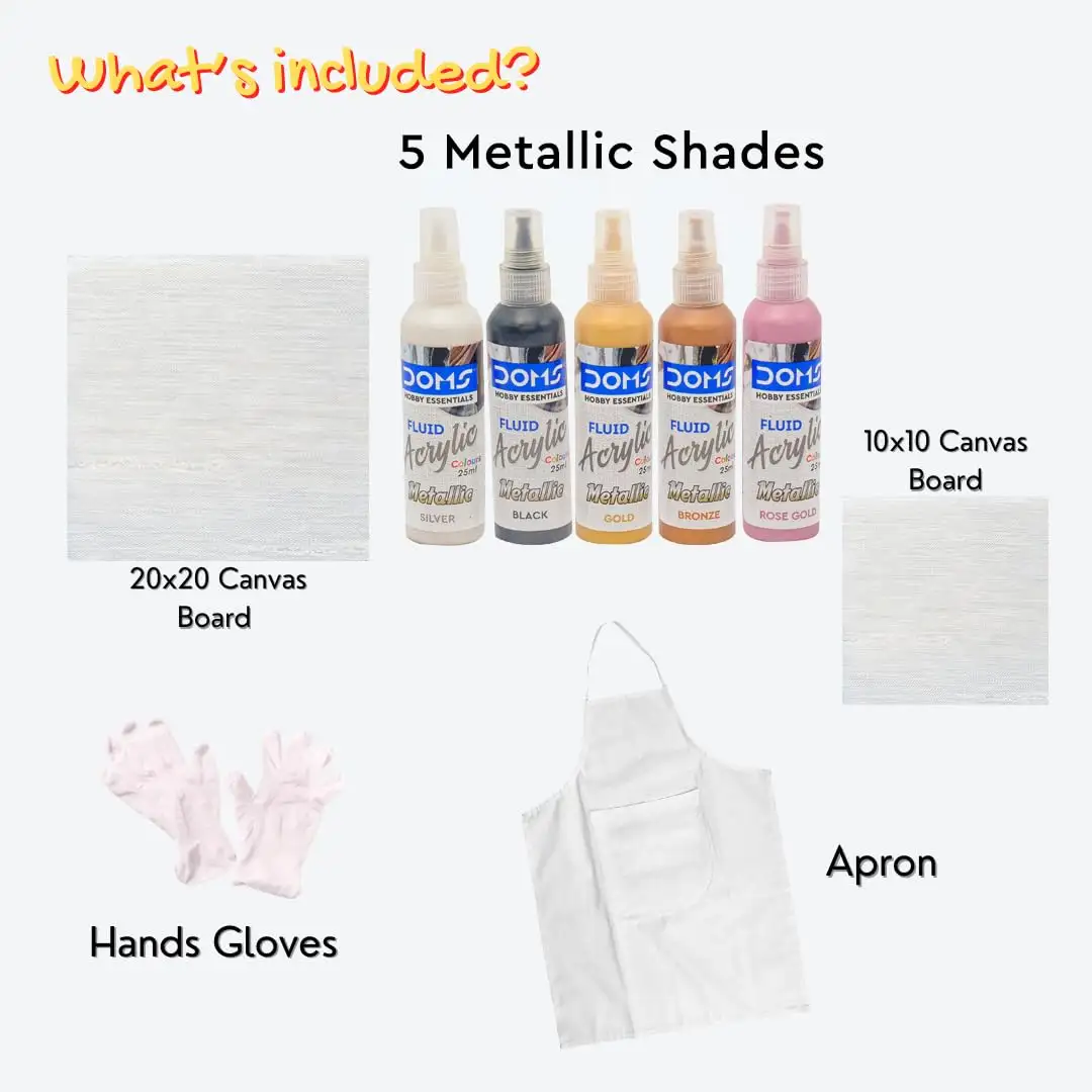 DOMS Metallic Fluid Acrylic Colour | 5 Assorted Metallic Colours Bronze, Rose Gold, Gold,Silver, Black of 25ml Each | 10 X 10 cm & 20 X 20 cm Canvas Board | 2 Gloves | Pack Of 1