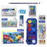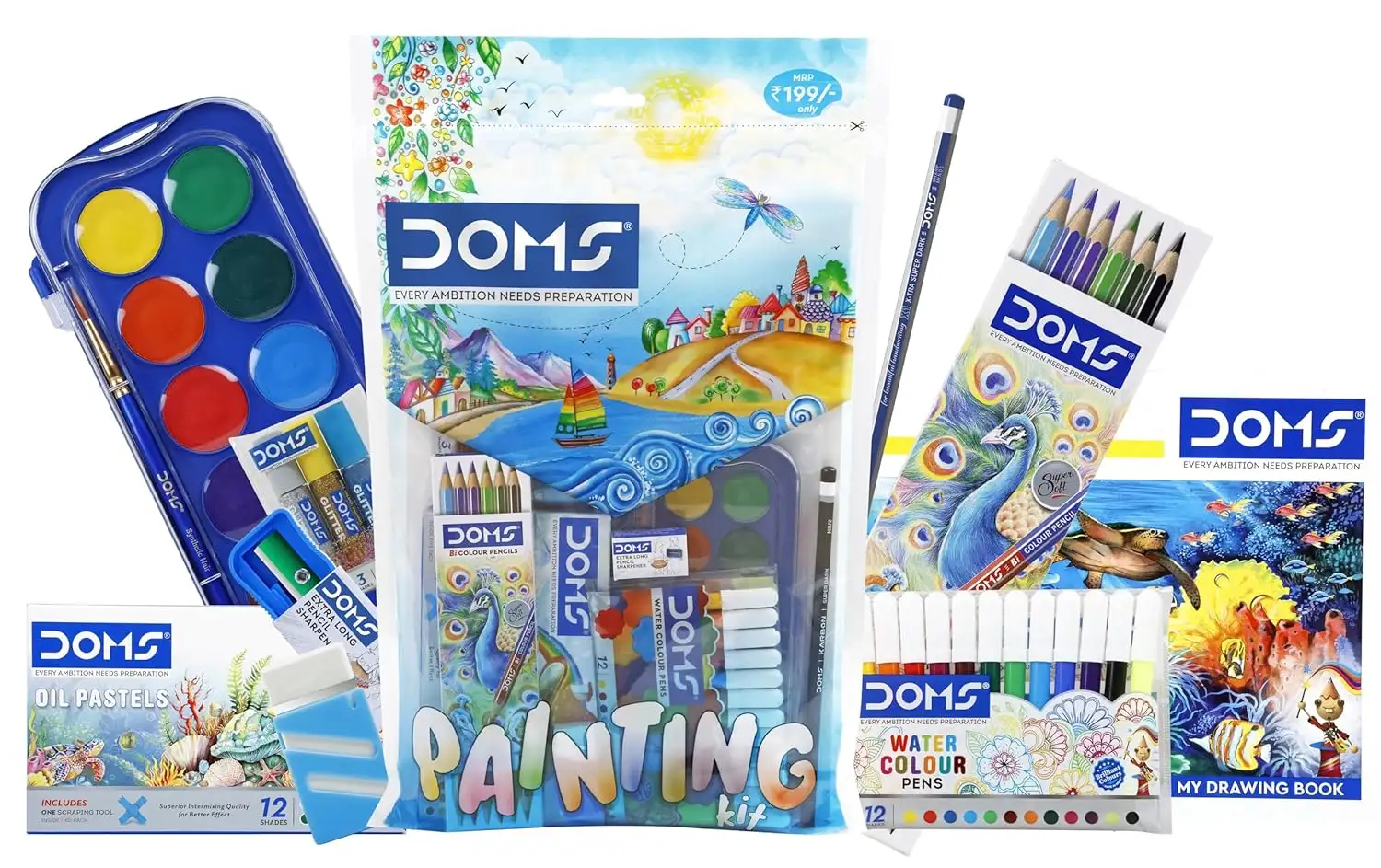 > Doms Painting kit contains -1 drawing book, 1 set bi color pencil (12 shades ), 1 set oil pastel (12 shades ), 1 set water colour pens (12 shades ) 1 Set water colour cake, 1 set plastic crayons, 1 set extra long wax crayons (12 shades ), 1 pencil kit