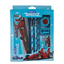 DOMS SPEEDZ Stationery Kit| Includes 1 SPEEDZ Compass Box,1 Sports Wheel Shape Eraser,1 Sharpener, 2 Pencils & 1 Pack of 12 Shades Wax Crayons| A Beautiful Gift for Children-Pack Of 1