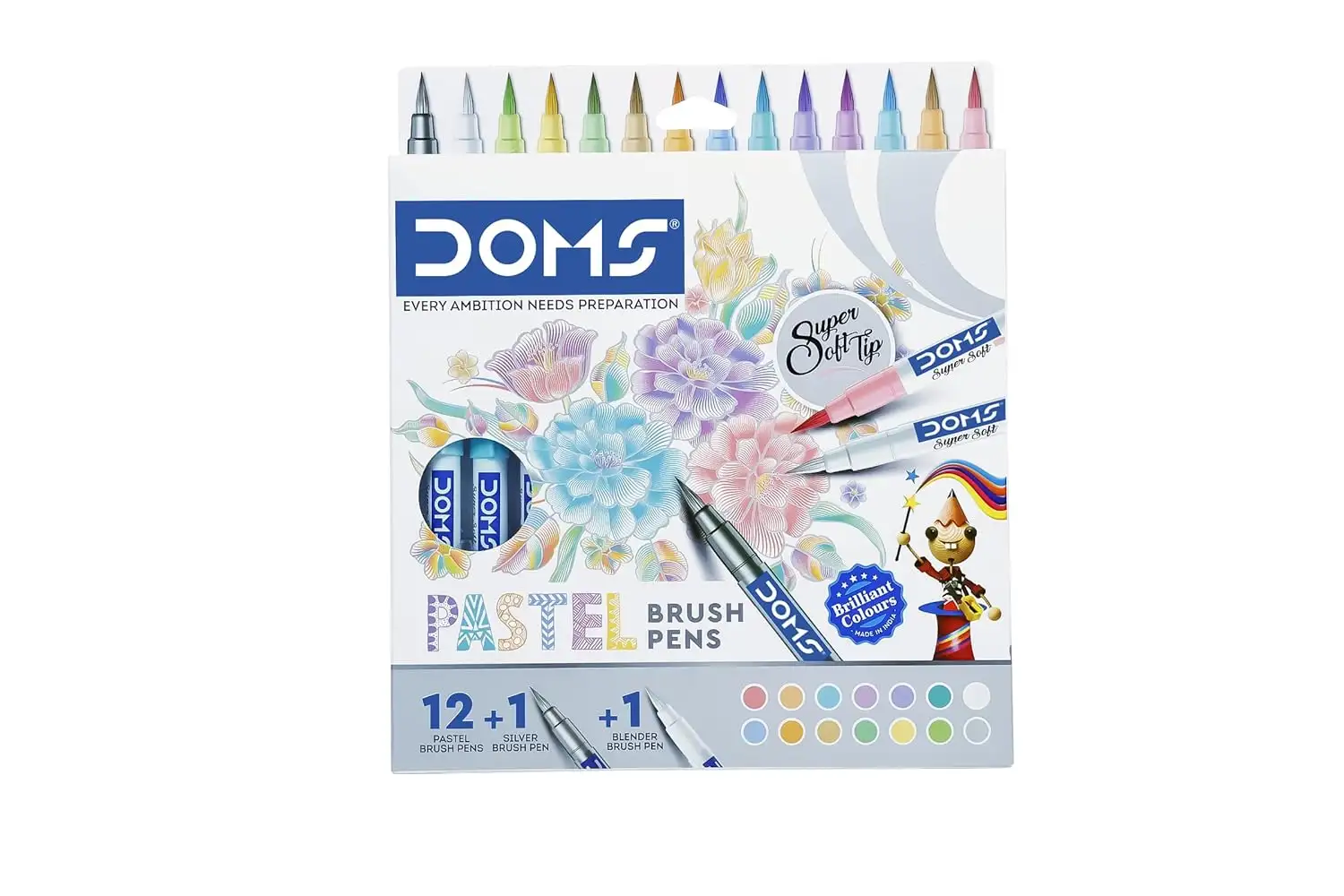 DOMS Super Soft Tip Pastel Shades Brush Pen Set | 12 Pastel Shades + 1 Silver Shade + 1 Blender | Ideal for Doodling, Illustrations, Calligraphy, Artists, Studenst & Professioanls | Pack of 1
