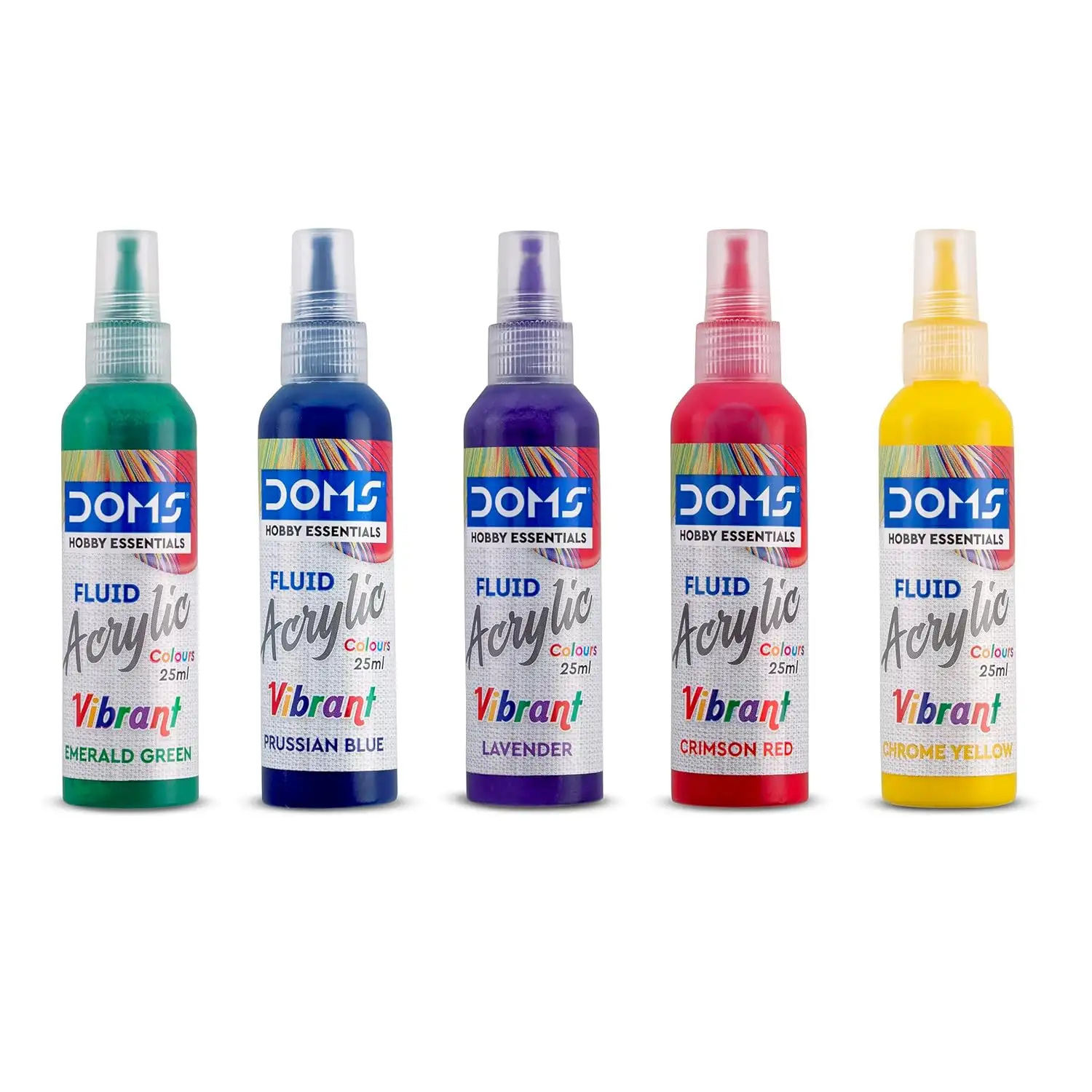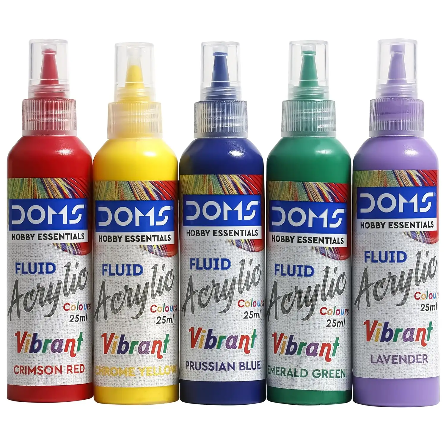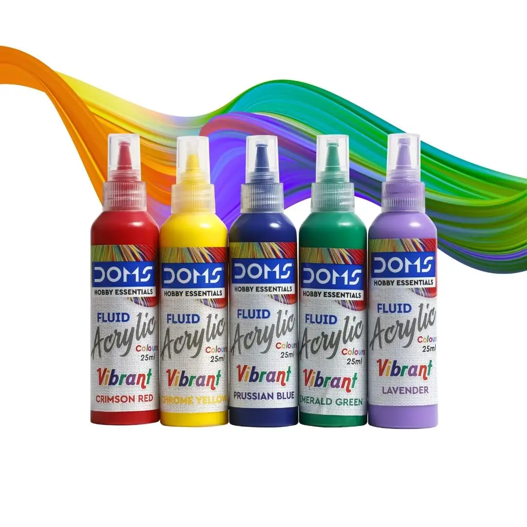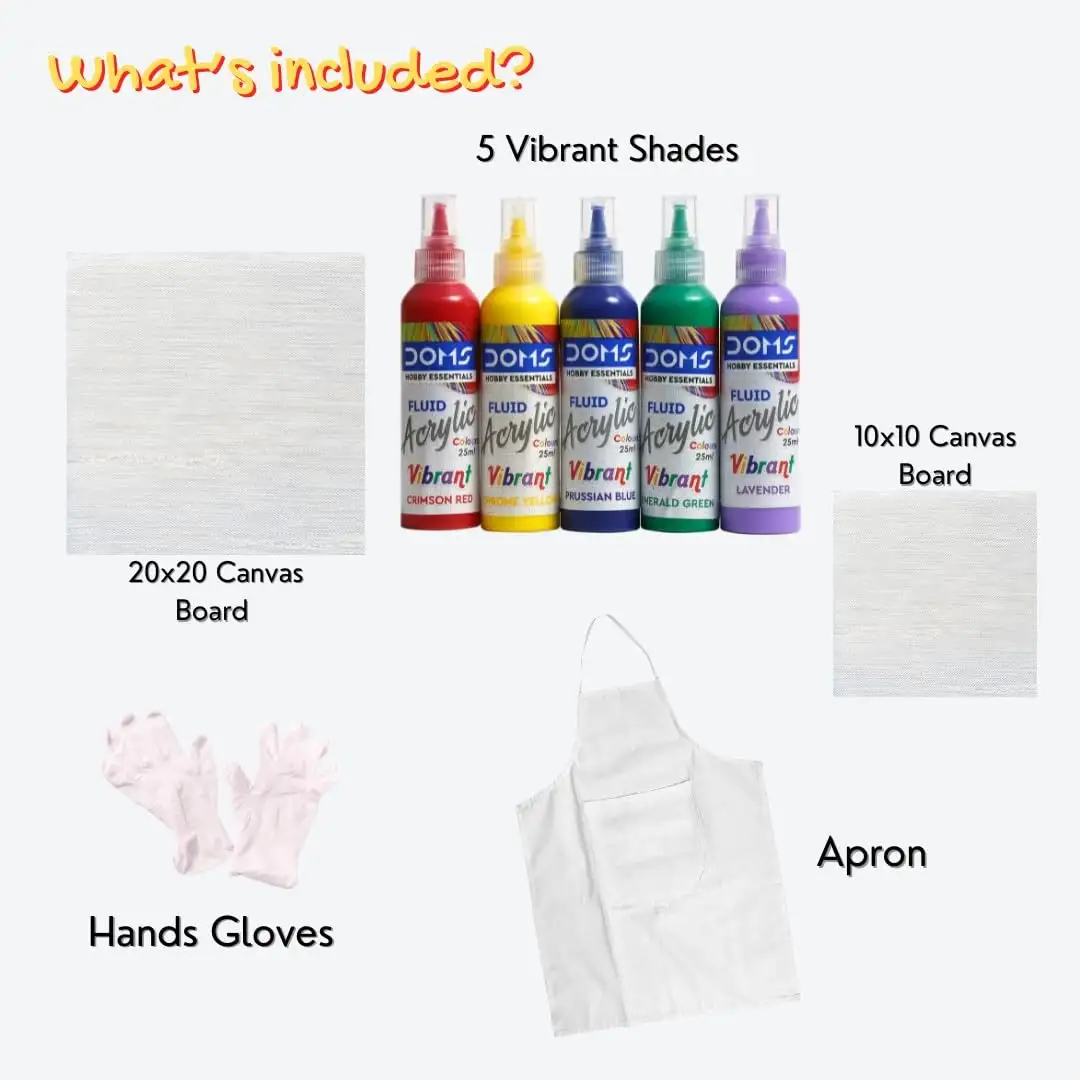 DOMS Vibrant Fluid Acrylic Colour | 5 Vibrant Colours Crimson RED, Chrome Yellow, Prussian Blue,EMRALD Green, Lavender of 25ml Each | 10 X 10 cm / 20 X 20 cm Canvas Board | 2 Gloves | Pack Of