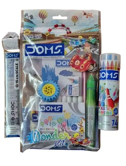 Doms Wonder Stationery Kit| Includes 9 Essential Daily Use Items Like Pencils, Sharpener, Eraser, 15 Cm. Scale, Wax Crayons, Plastic Crayons, Sketch Pen, Gum & Colouring Book| Pack of 3