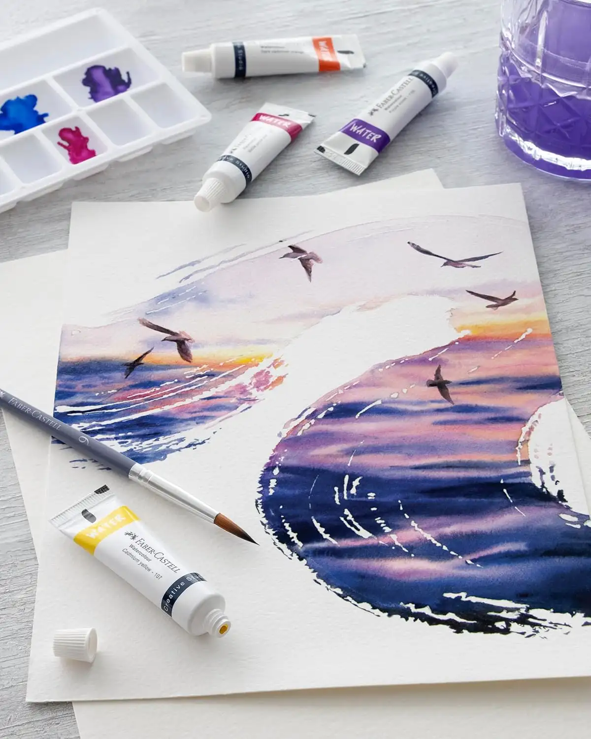 > Artist-grade colours specially formulated for beginners and students exploring watercolour techniques