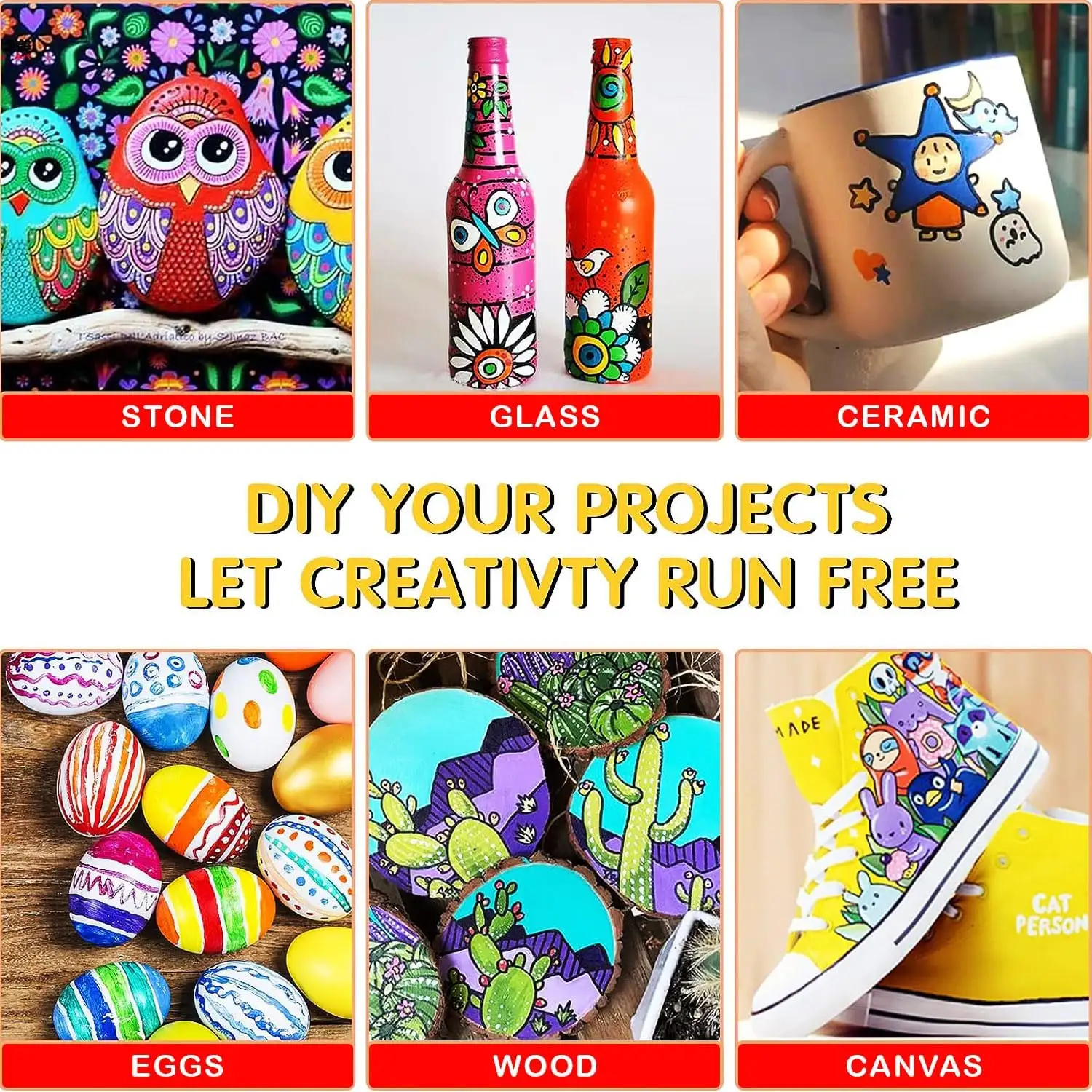 > Multi-Purpose : Enjoy Creating Art Projects On A Variety Of Surfaces, Acrylic Paint Marker Set Suitable For Rock Painting, Ceramic And Mug Painting, Glass Painting, Wood, Fabric, Stone, Metal, Plastic, Canvas, Ornament, Calligraphy, Scrapbook, Bullet Journal, Custom Mugs, Diy Crafts Projects, And Much More For Both Smooth And Porous Surfaces.