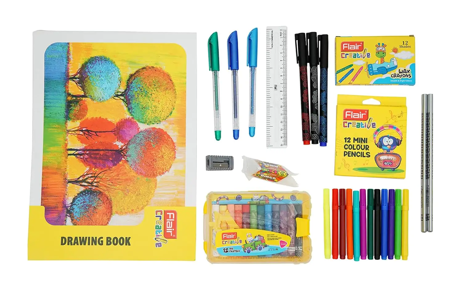 > Package Includes - 1 N Drawing Book, 2 N Wooden Pencil, 1 N Sketch Pen Pack (12 Shades), 1 N Wax crayons (12 Shades), 1 N Oil Pastels (12 Shades), 1 N Plastic Scale 15 cm, 1 N Sharpner, 1 N Eraser, 1 N Mini Colour Pencil Pack (12 Shades), 3 N Glitter Gel Pen, 3 N Hotline Fineliner Pen, 1 N Bag