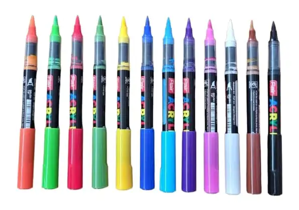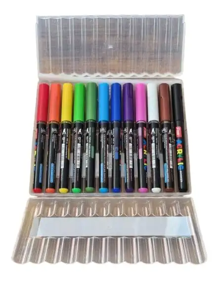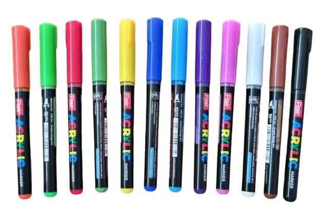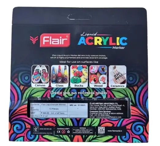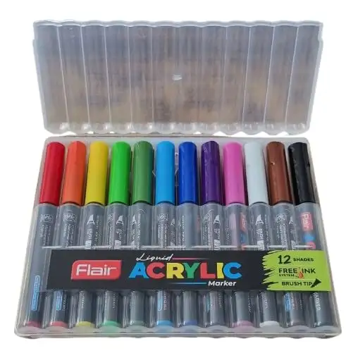 > About this item Flair Acrylic Brush Tipped Marker – Set of 12 Colors Markers With Transparent Hard Case, These Colors Markers Comes With Highly Pigmented Rich Colour Paint Pen for Rock Painting, Canvas, Glass, Rocks, Wood, Ceramics etc. Any Surface – Flair Acrylic Marker Colors Works on almost all surface, & Allows you to easily write on clothes, rock markers, ceramics, shoes, glass, mirrors, windows, plastic, fabric, wood, canvas, paper, metal, body, cars, etc You'll love the steady flow of this marker to produce eye-catching artwork. Superior-Quality Acrylic Ink colors with a vibrant opaque finish that is safe, non-toxic, and waterproof. SHAKE WELL BEFORE USE, STORE IN HORIZONTAL POSITION.