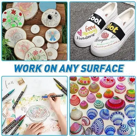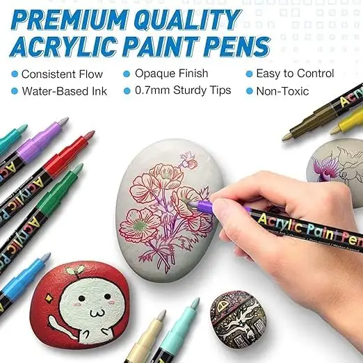 > SAFE& NON-TOXIC-Acrylic paint pens use WATER-BASED environmentally friendly pigment inks, NON-TOXIC and ODORLESS, SUM-PROOF, water-proof, quick-drying, NO LEAKAGE, strong covering power, Adults and children can use it with confidence.