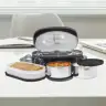> Colour: Black, Material: Stainless Steel and Plastic. Package contents : 1 - Piece Exective lunch Box (2 Round container and 1 Oval container) (280 ml, 280 ml, 450 ml)