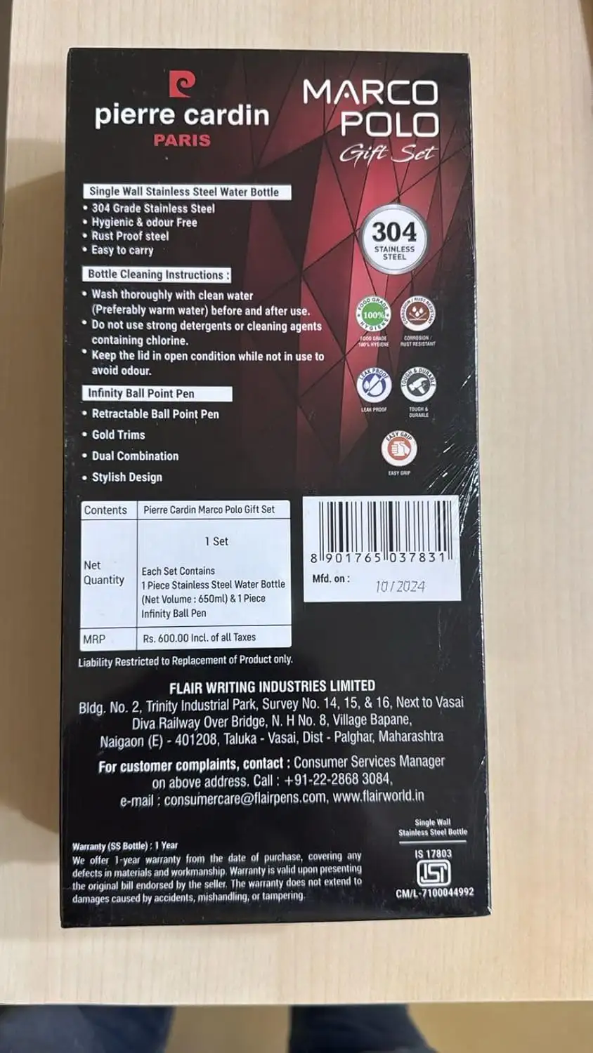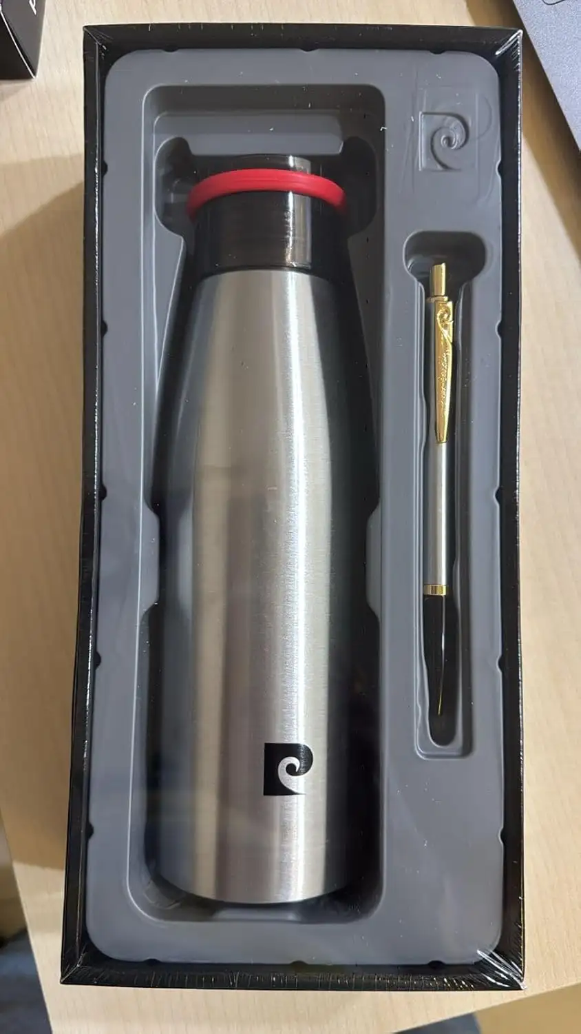 > Luxury Gift Set: Indulge in a sophisticated gift set featuring a stainless steel water bottle and an infinity ball pen from the renowned Pierre Cardin Marco Polo collection.