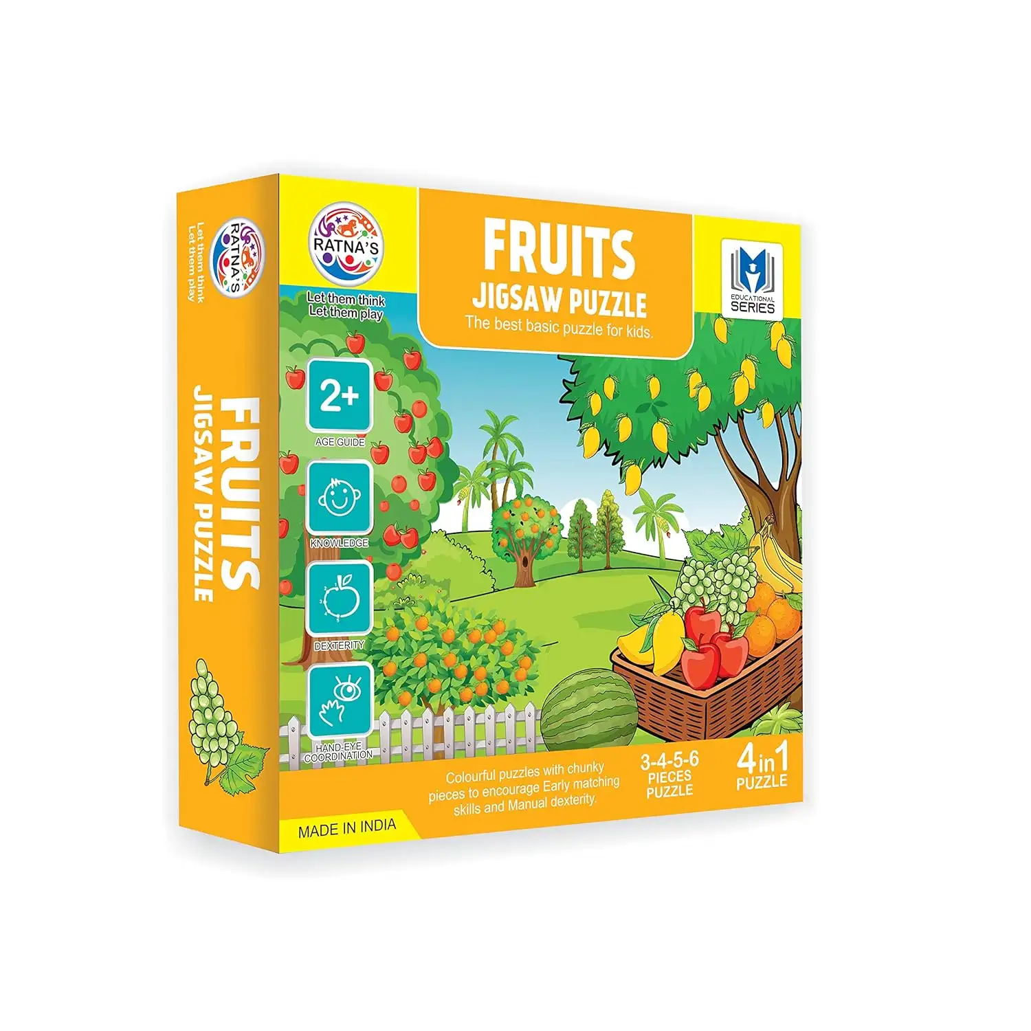 > Ratnas brings this fruit picture puzzle for kids. It develops child's cognitive skills and problem solving skill in all. It teaches children about different domestic farm animals and promotes education in a fun way. Each picture is with name and knobs. Improves motor skills, and develops hand-eye co-ordination. This Puzzle is non-toxic inks and 100% child-safe.