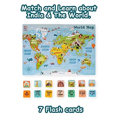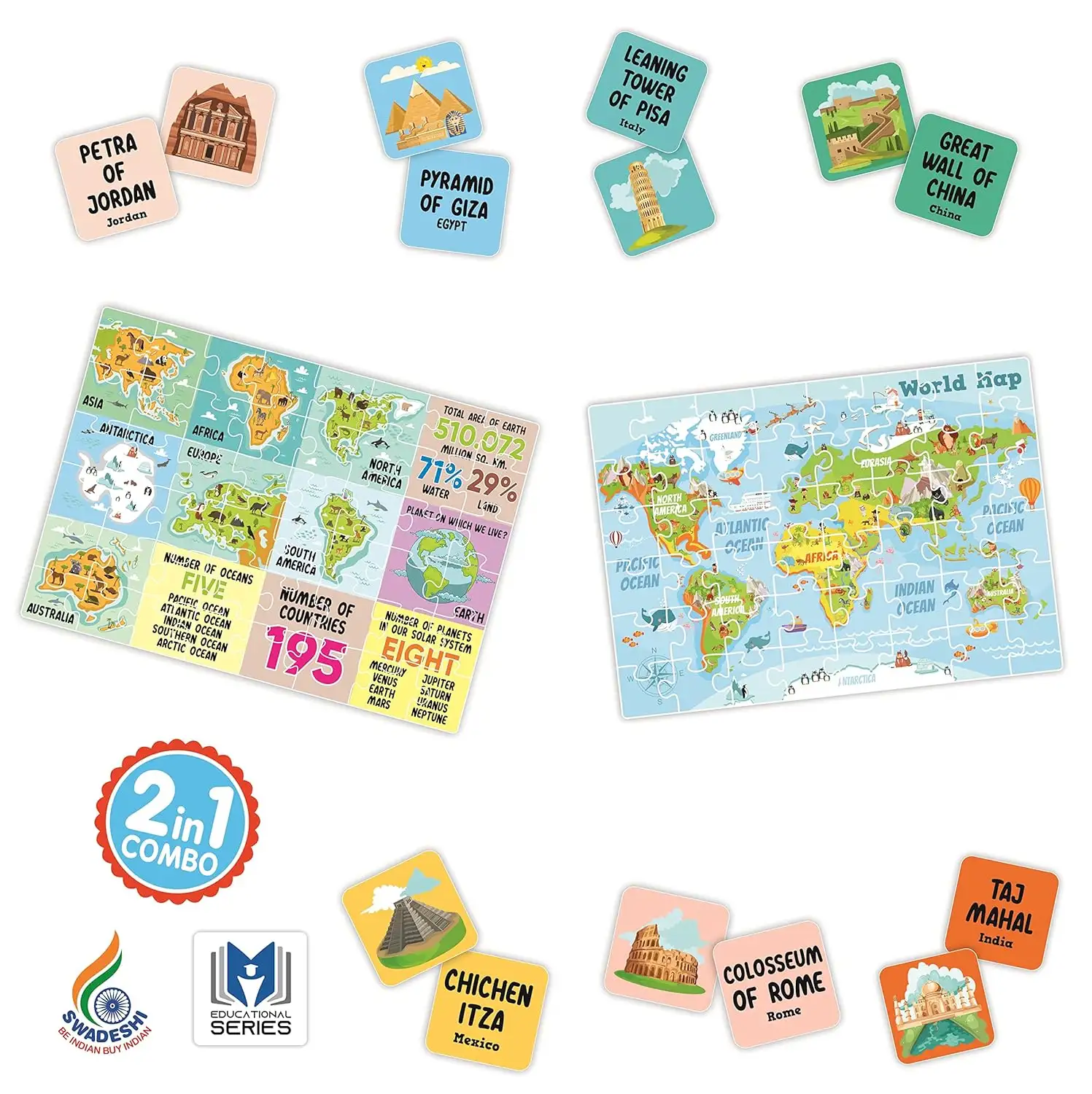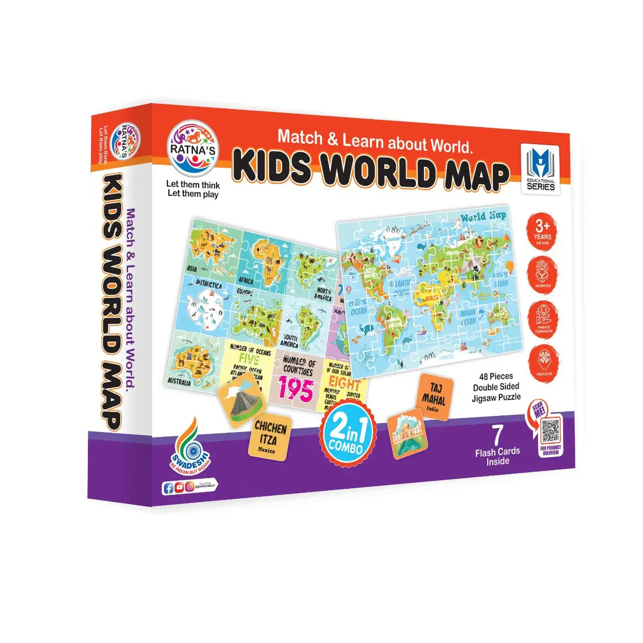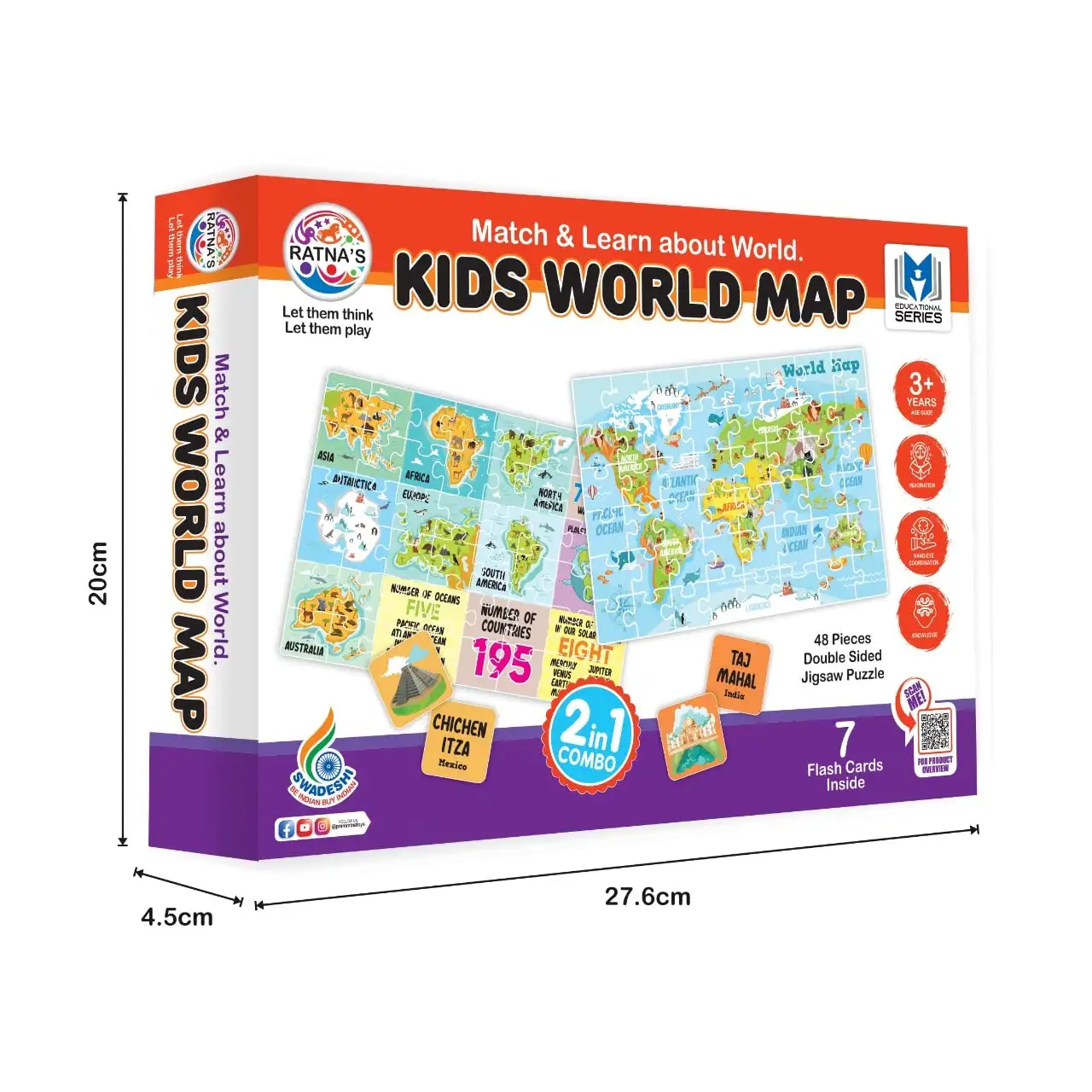 Ratna's Kids World Map Jigsaw 2 in 1 Combo 48 Pieces Double Sided Jigsaw Puzzle with Flash Cards Educational Toys for Kids 3+ Years | Pack Of 1