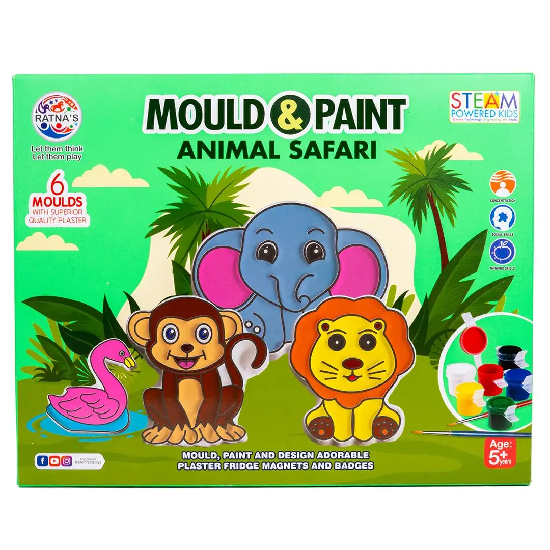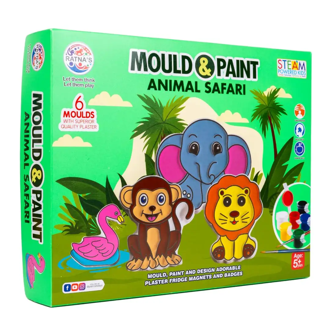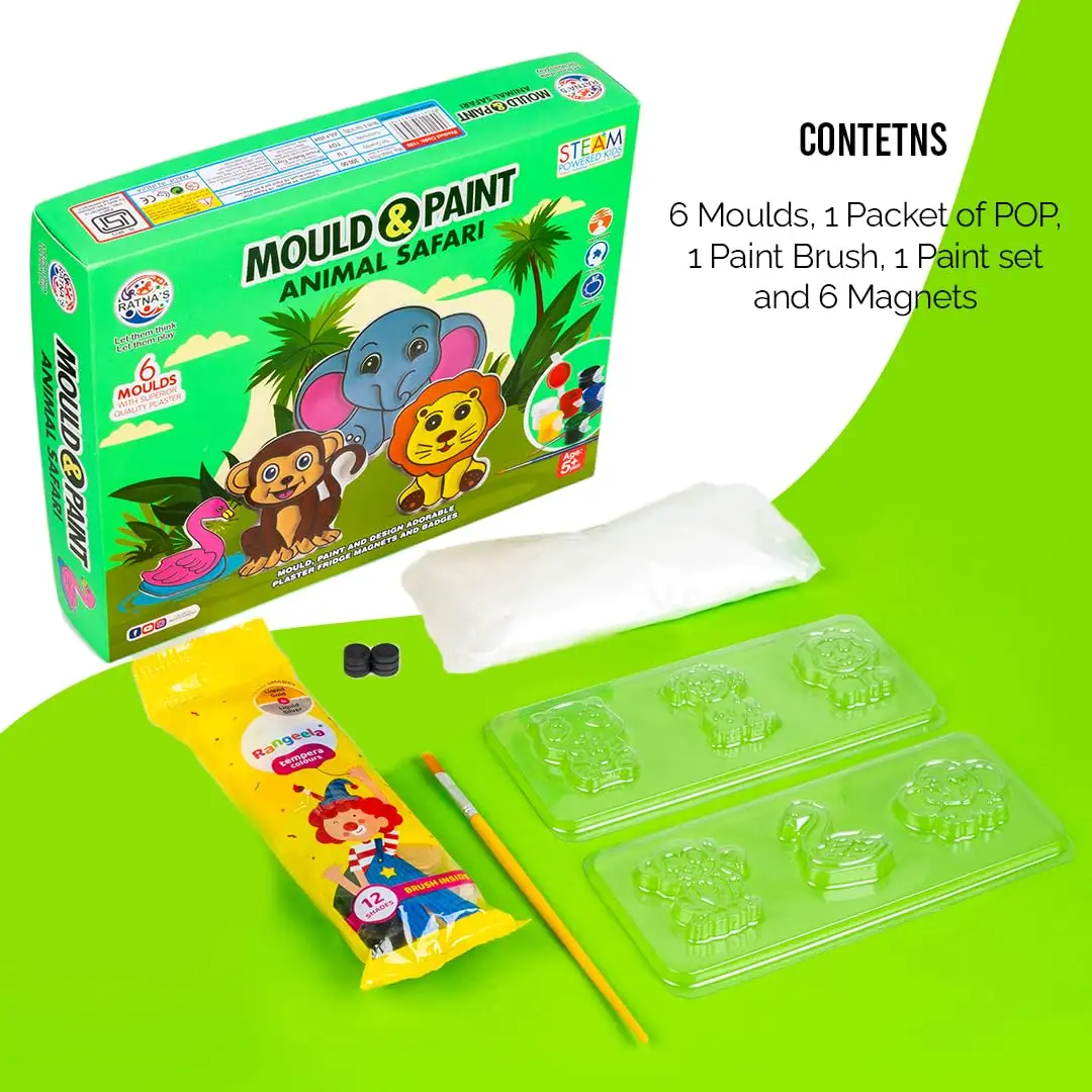 RATNA'S Mould and Paint Animal Safari DIY Kit, Create Adorable Fridge Magnets & Badges, 6 Moulds with Plaster, Art and Craft Kit for Ages 5+ | Pack Of 1