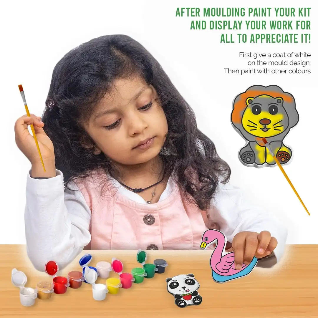 > Painting Supplies: The kit comes with vibrant paints and a brush, allowing kids to unleash their creativity and paint the animal figurines as desired. For best results, first give a coat of white paint on the moulded designs & then paint with other colours.