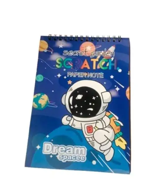 > CREATIVE DESIGN: Space-themed scratch art notebook featuring magical black-coated pages that reveal vibrant rainbow colours when scratched, perfect for artistic expression