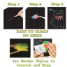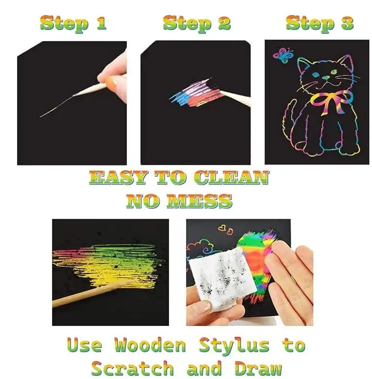 > EASY TECHNIQUE: Simply scratch the black coating with the provided wooden stylus to uncover stunning multicoloured patterns underneath
