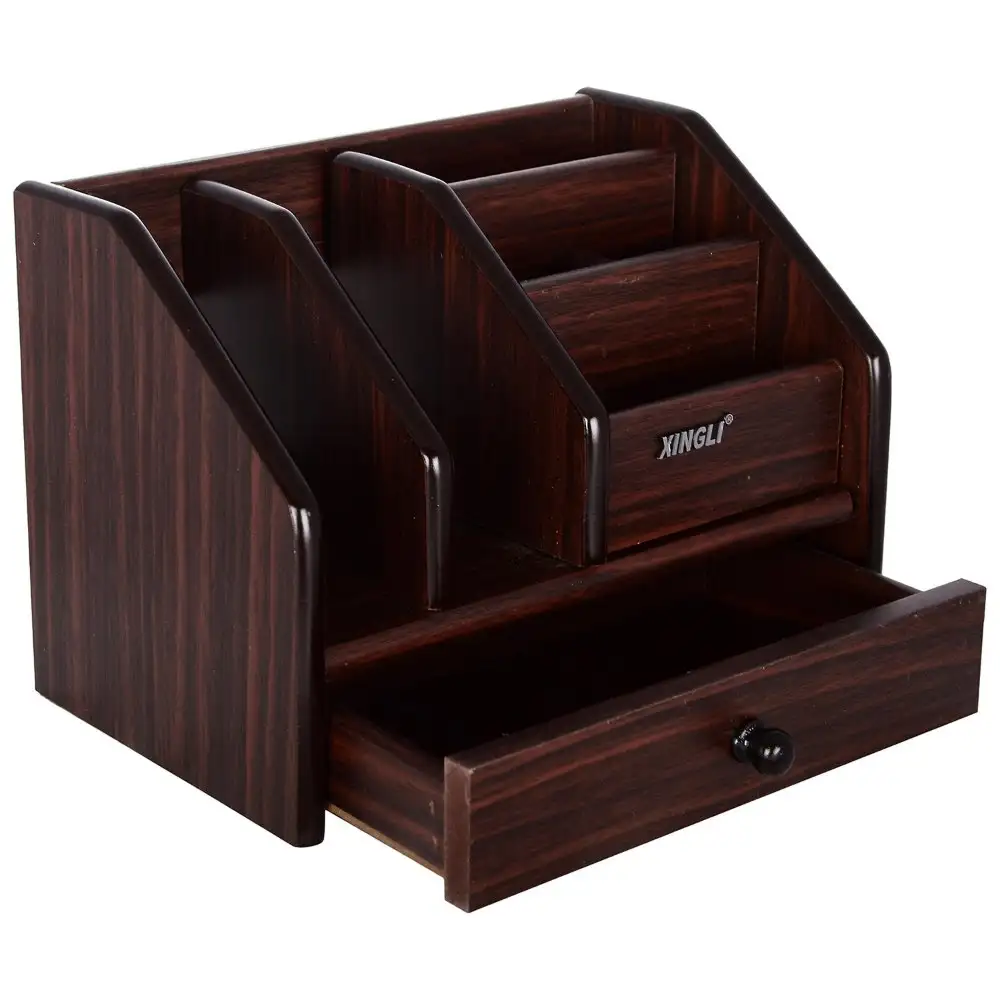 XINGLI Multi-Utility Wooden Desk Organiser, Pen Stand/Pencil Stand with Book Shelf,Drawer, Stationery Stand for Office and Students use - Mobile Holder for Desk (Brown) | PACK OF 1