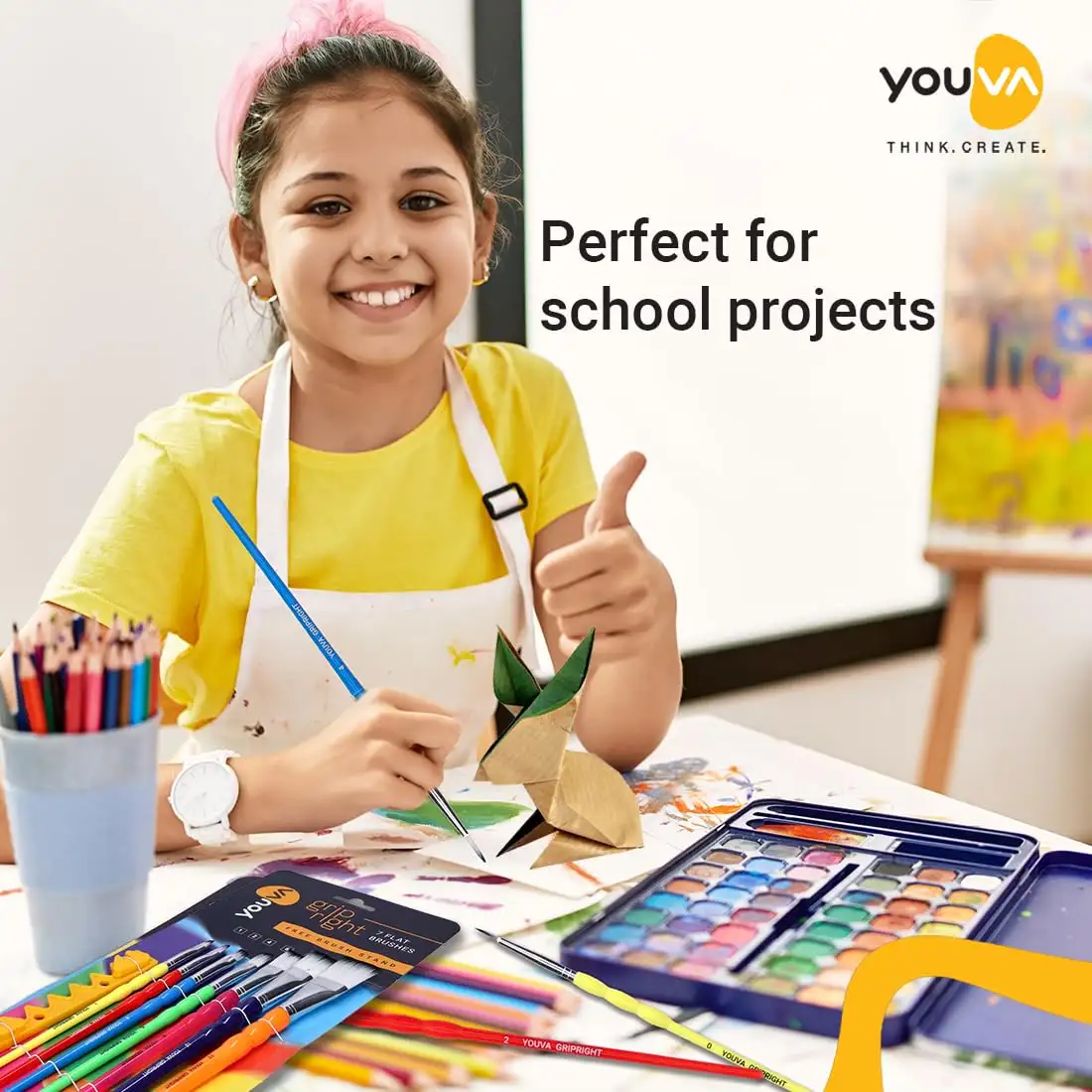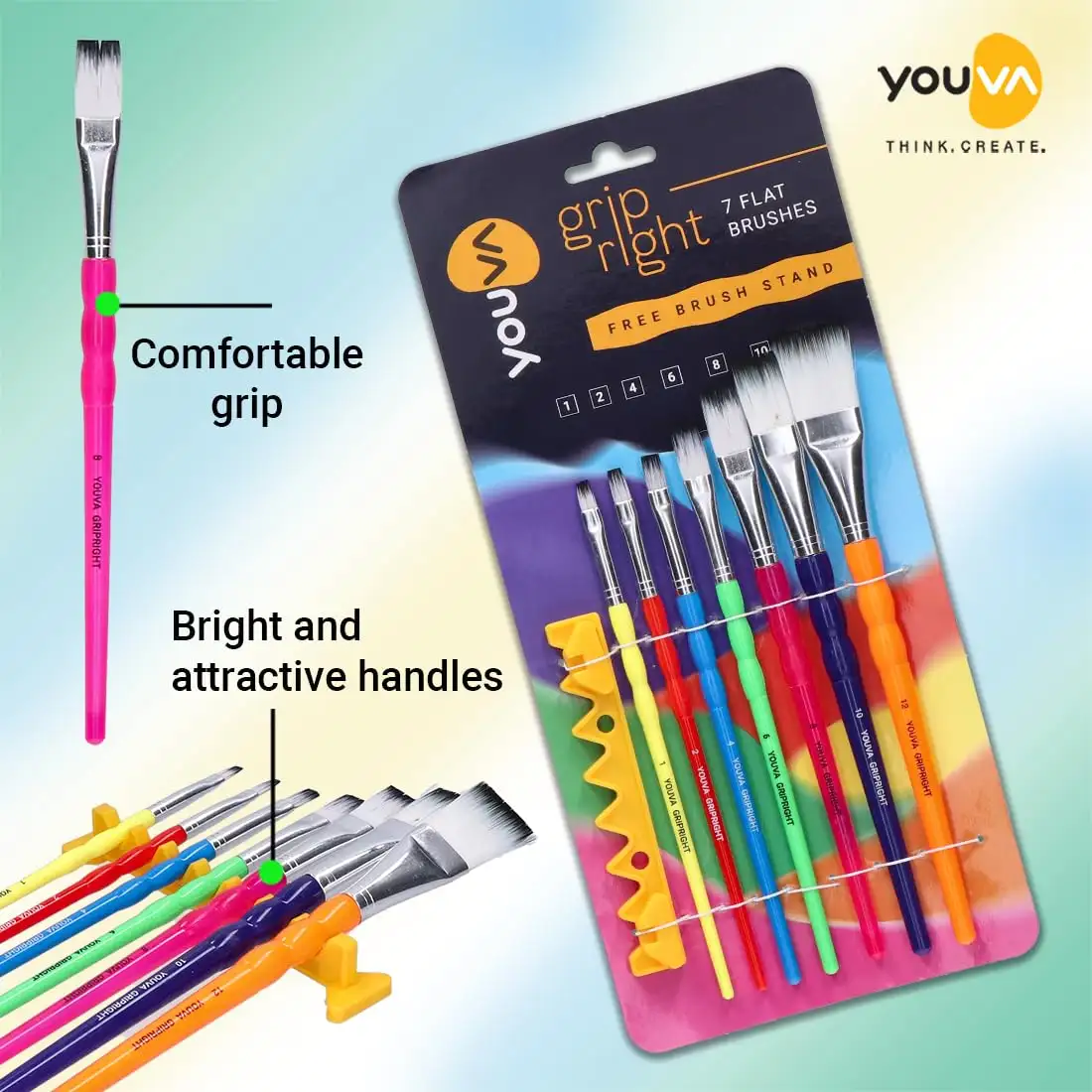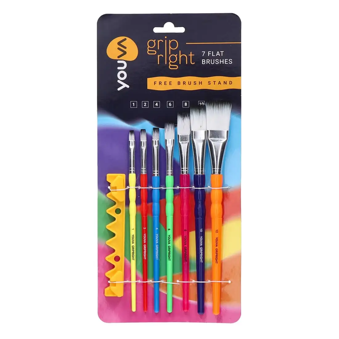 Youva Grip Right Brushes| 7 Flat Brushes with Free Brush Stand| Size- F No. 1,2,4,6,8,10,12 |for Professionals | Pack Of 1